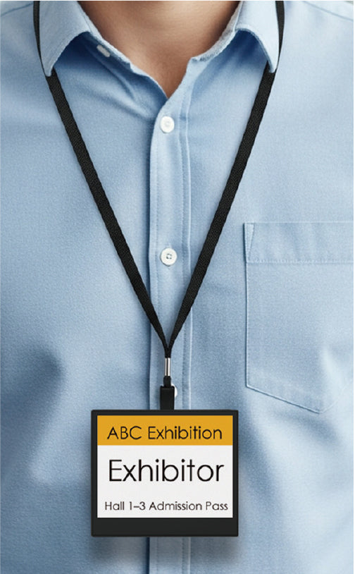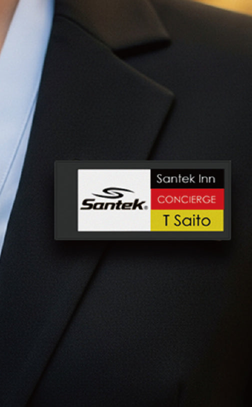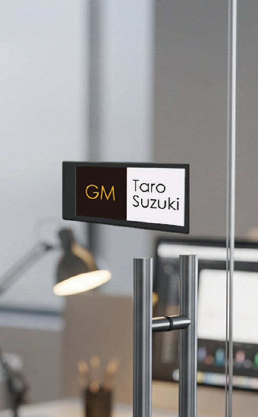 壁面の案内表示、社員証・ネームタグの掲示、エントランスのサイン、展示会・店舗什器での情報表示として。